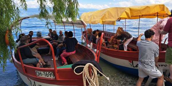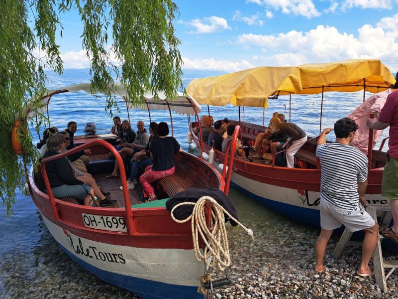 Stel je dit voor: we stappen aan boord van die schattige rood-wit-blauwe bootjes op het prachtige strand van Pestani. En vanaf dat moment begint ons avontuur op het meer van Ohrid! Terwijl we rustig langs de kust varen, worden we getrakteerd op adembenemende uitzichten op hoge rotsen en het spectaculaire Nationale Park Galicica. Dit is echt een ansichtkaartwaardig moment!Na een ontspannen tochtje komen we aan in het charmante vissersdorp Trpejca, ook wel bekend als het Saint Tropez van Ohrid. Hier maken we een pitstop voor een lekker kopje koffie aan het water, genietend van de serene sfeer en het uitzicht over het meer. We vervolgen onze reis naar het klooster van Sveti Naum. Na het verkennen van de indrukwekkende bronnen van het meer van Ohrid, stappen we weer aan boord voor een tocht langs de prachtige zandstranden en terrasjes.